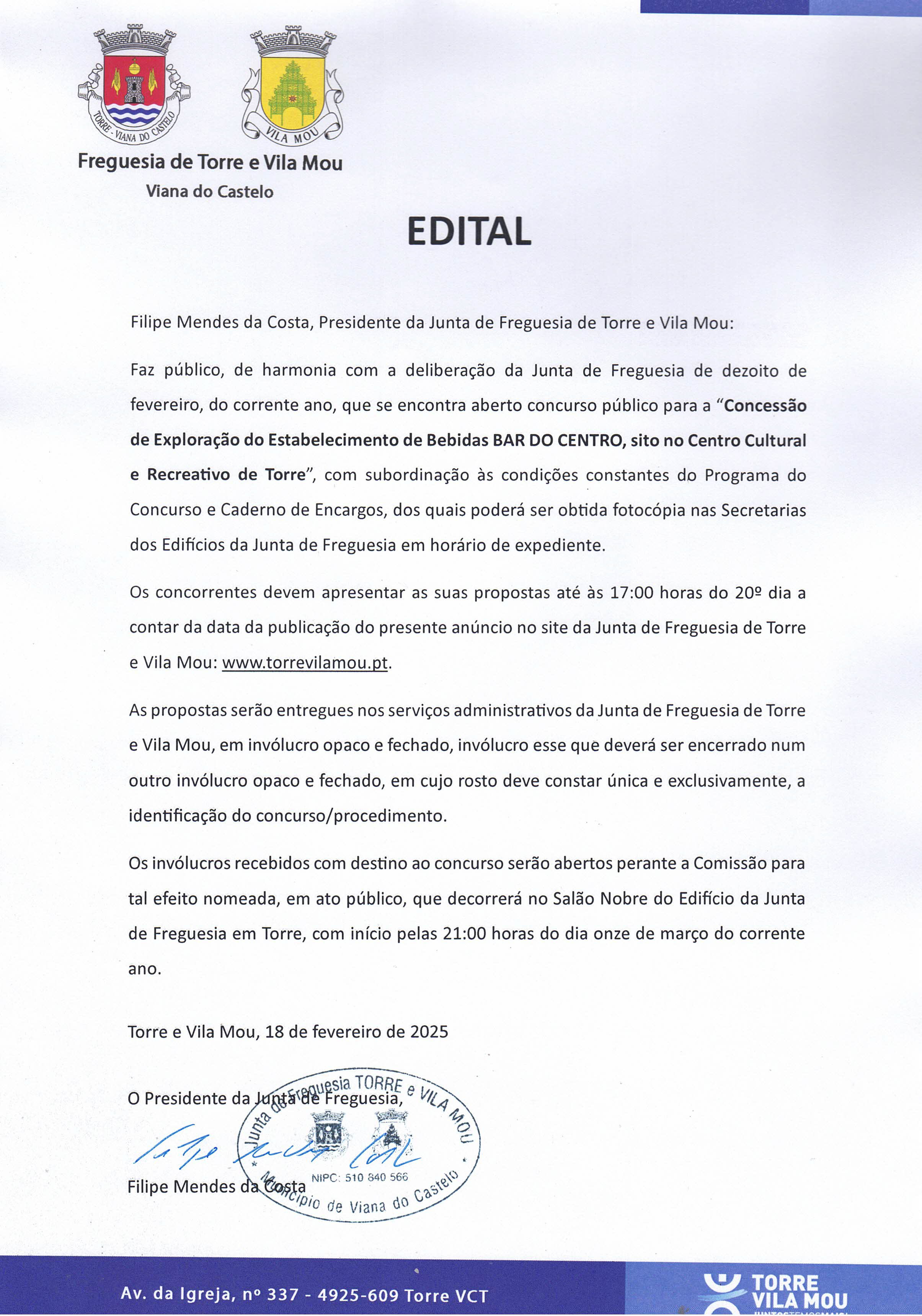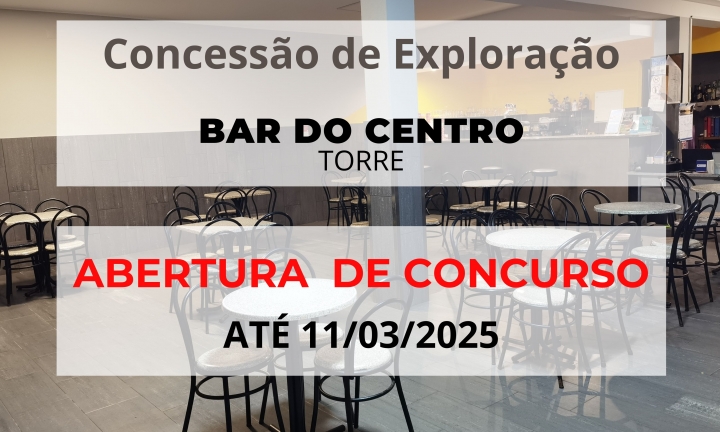 Encontra-se aberto concurso público para a Concessão de Exploração do Estabelecimento de Bebidas, designado por BAR DO CENTRO em Torre, sito no Rés do Chão do Centro Cultural e Recreativo de Torre, até ao próximo dia 11 de Março de 2025, conforme edital abaixo.