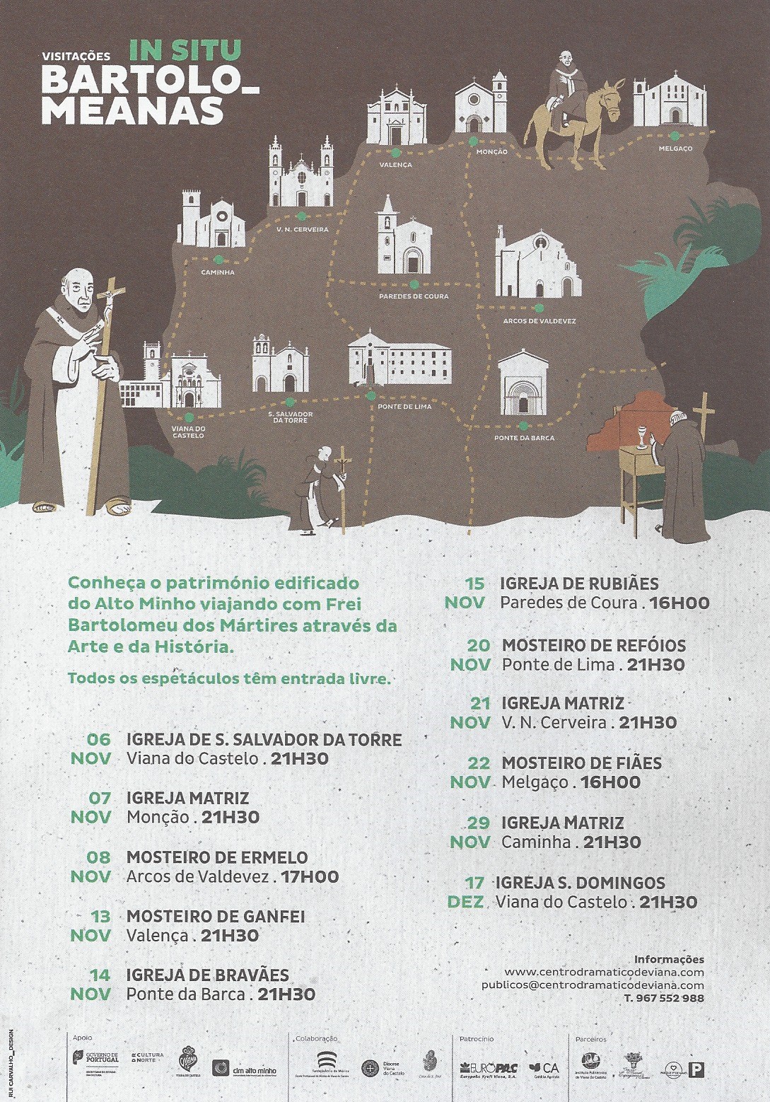 Têm inicio no dia 6 de Novembro, pelas 21h30, na Igreja Paroquial de S. Salvador da Torre as apresentações do projecto teatral "In Situ - Visitações Bartolomeanas", promovido pelo Teatro do Noroeste - CDV. As apresentações irão percorrer onze igrejas, conventos e monumentos do Alto Minho, pelos quais passou o Beato Frei Bartolomeu dos Mártires, no século XVI.