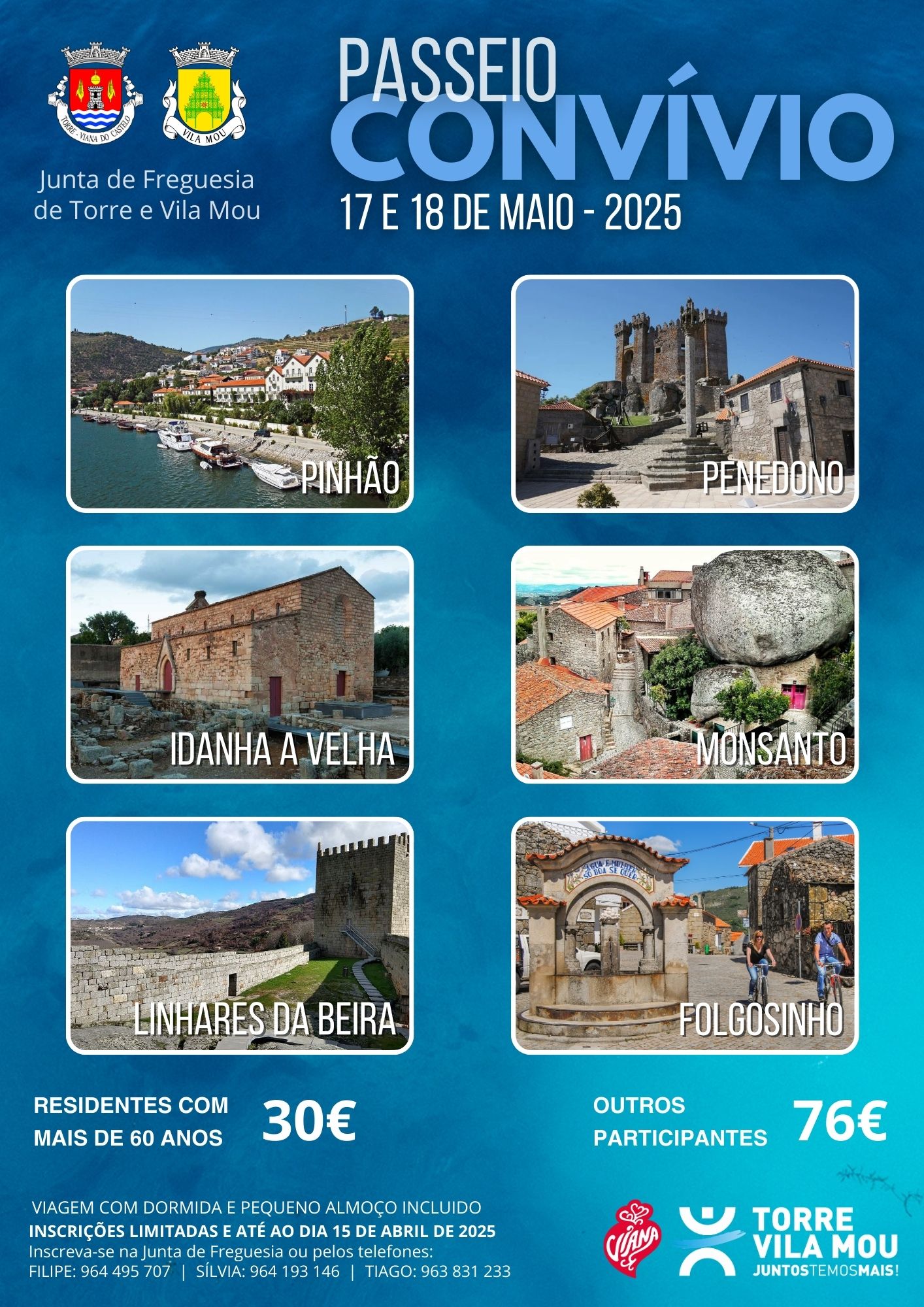 A Junta de Freguesia de Torre e Vila Mou está a organizar o habitual do Passeio Convívio de 2 Dias, que decorrerá nos dias 17 e 18 de maio de 2025. Esta iniciativa tem como principal objetivo proporcionar um momento de lazer e convívio entre os habitantes da freguesia, reforçando os laços de união e o espírito de comunidade.